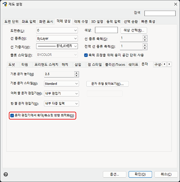 제도 설정 - 객체 생성 - 문자 - '문자 편집기에서 확대/축소 및 방향 최적화' 옵션의 체크를 해제하여 사용하셨던 경우,