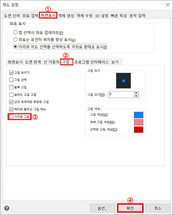 2. 화면표시 > 그립 > 다각형 그립 체크 해제 > 확인